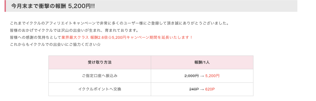 イククルの直提携単価は「無料会員登録5,200円」です。他の出会い系と比べるとイククルの成果報酬は高いです。