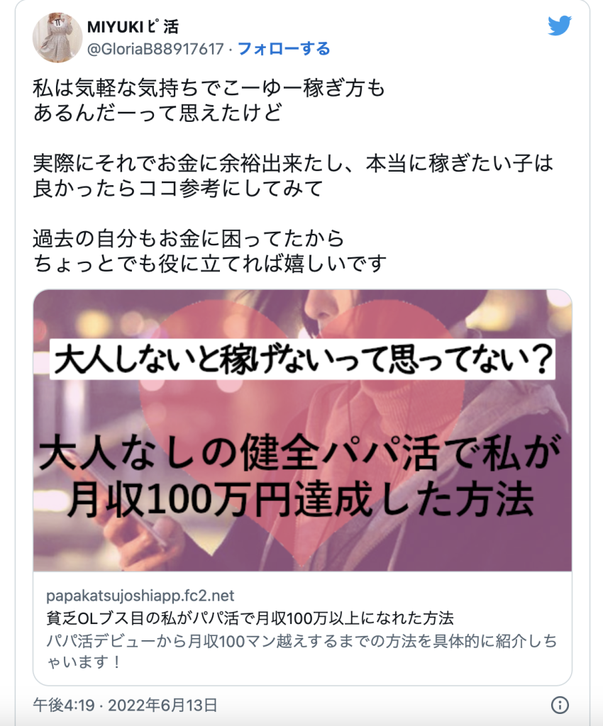 - パパ活で稼げてること、パパ活のコツ・注意点などを発信。パパ活に興味がある女性を集める