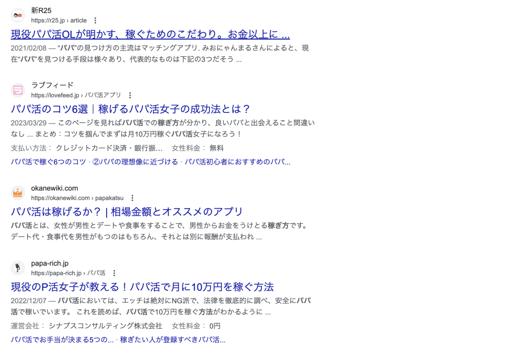 他にも「パパ活 比較」「パパ活 始め方」のような成約しやすい検索ワードは企業メディアが検索上位を押さえてます。