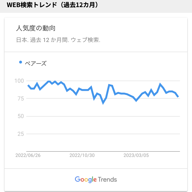 こちらはペアーズの1年間の検索動向なのですが、2012年に利用開始しましたが、現在もなお検索ボリュームがあります。