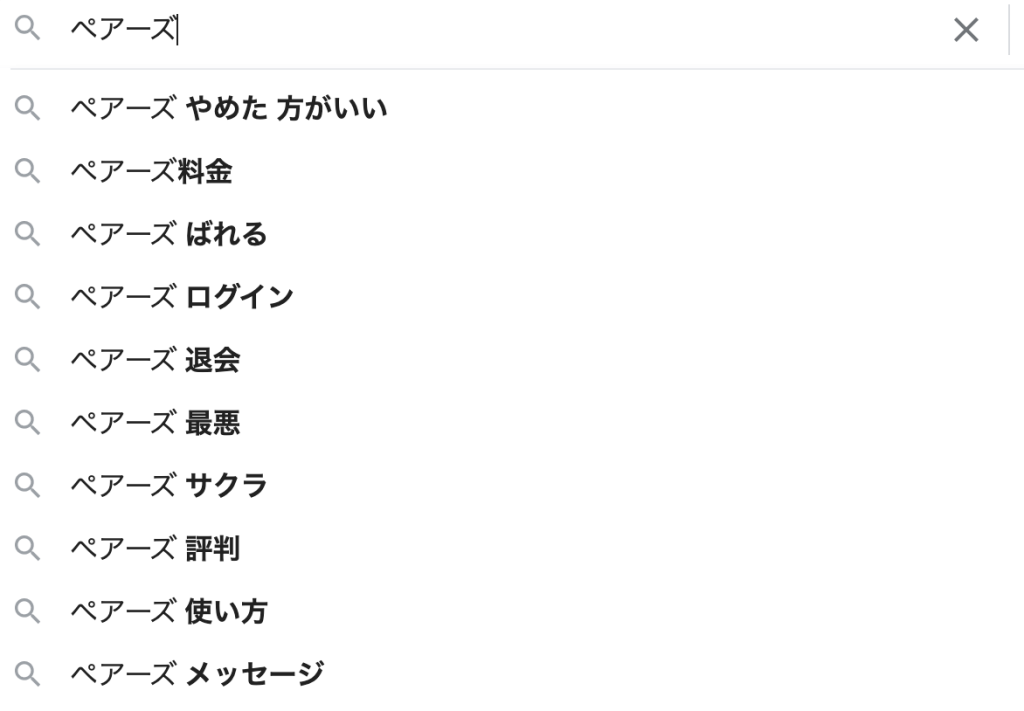 具体的には「ペアーズ」「ペアーズ 料金」「ペアーズ メッセージ」などのキーワードです。